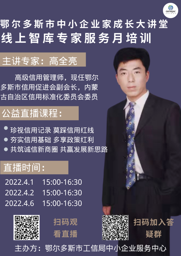 為進一步引導我市中小微企業(yè)增強社會責任感,幫助企業(yè)營造“知信、用信、守信”的良好信用氛圍,以誠信立業(yè),以誠信創(chuàng)造價值,助力我市中小微企業(yè)健康發(fā)展。4月1日,鄂爾多斯市中小企業(yè)家成長大講堂線上智庫專家服務培訓將為您帶來精彩直播課程——珍視信用記錄、莫踩信用紅線。本次課程我們邀請到鄂爾多斯市中小企業(yè)公共服務平臺智庫專家、內蒙古自治區(qū)信用標準化委員會委員、內蒙古立德征信服務有限公司戰(zhàn)略導師高全亮為大家直播授課。