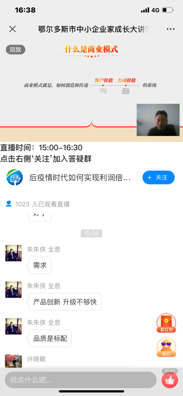 3月28日下午,由鄂爾多斯市工信局中小企業(yè)服務(wù)中心舉辦的鄂爾多斯市中小企業(yè)家成長(zhǎng)大講堂線上智庫(kù)專家服務(wù)月培訓(xùn)第8期線上課程“后疫情時(shí)代如何實(shí)現(xiàn)利潤(rùn)倍增”專題培訓(xùn)順利開(kāi)展,全市中小企業(yè)管理者及工作人員共計(jì)1000多人次觀看直播。