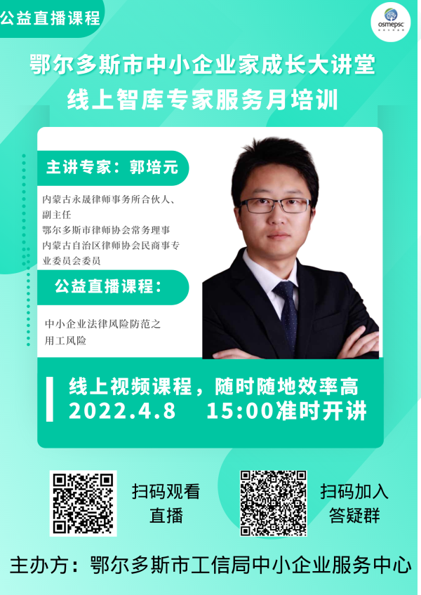 為進(jìn)一步增強(qiáng)中小企業(yè)用工法律風(fēng)險(xiǎn)的防范意識(shí),幫助企業(yè)依法規(guī)范勞動(dòng)關(guān)系,規(guī)避勞動(dòng)用工管理中存在的法律風(fēng)險(xiǎn),2022年4月8日,鄂爾多斯市中小企業(yè)家成長(zhǎng)大講堂線上智庫專家服務(wù)月培訓(xùn)將為您帶來精彩直播課程——中小企業(yè)法律風(fēng)險(xiǎn)防范之用工風(fēng)險(xiǎn)。本次課程我們邀請(qǐng)到鄂爾多斯市中小企業(yè)公共服務(wù)平臺(tái)智庫專家,內(nèi)蒙古永晟律師事務(wù)所合伙人、副主任,鄂爾多斯市律師協(xié)會(huì)常務(wù)理事郭培元為大家直播授課。
