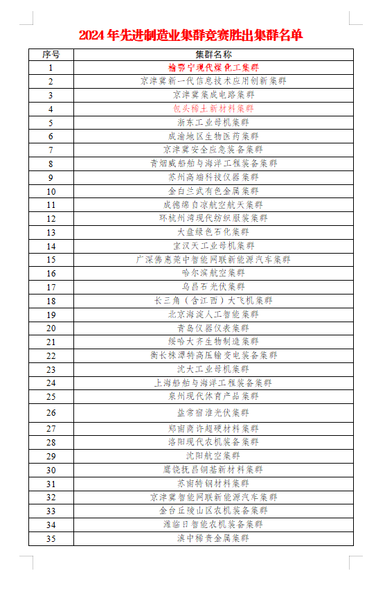 貫徹落實(shí)黨中央、國務(wù)院關(guān)于加快培育壯大先進(jìn)制造業(yè)集群的決策部署,工業(yè)和信息化部組織開展2024年先進(jìn)制造業(yè)集群競賽。按照《工業(yè)和信息化部辦公廳關(guān)于組織開展2024年先進(jìn)制造業(yè)集群競賽的通知》(工信廳規(guī)函〔2024〕252號)要求,經(jīng)小組賽和綜合賽2輪專家評審,榆鄂寧現(xiàn)代煤化工集群等35個集群勝出。