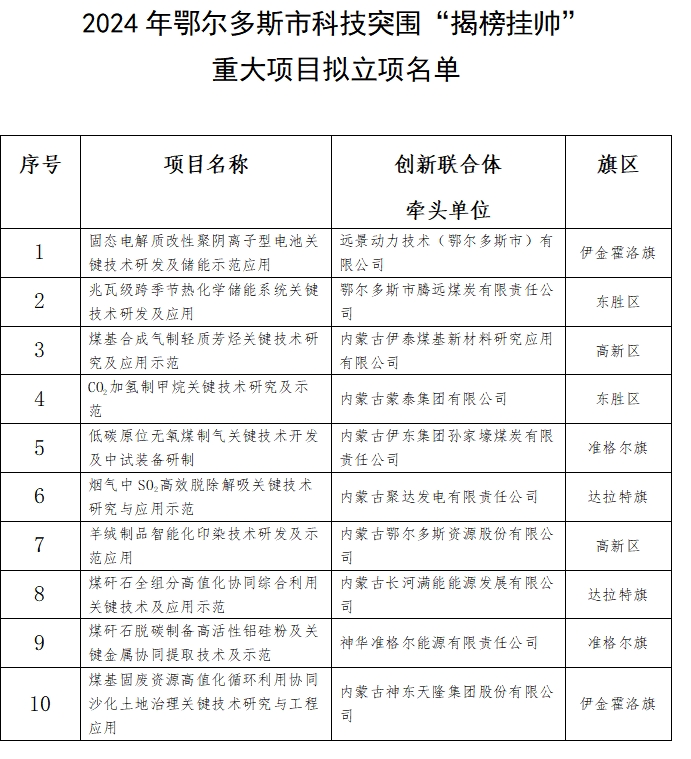 附件:2024年鄂爾多斯市科技突圍“揭榜掛帥”重大項目擬立項名單