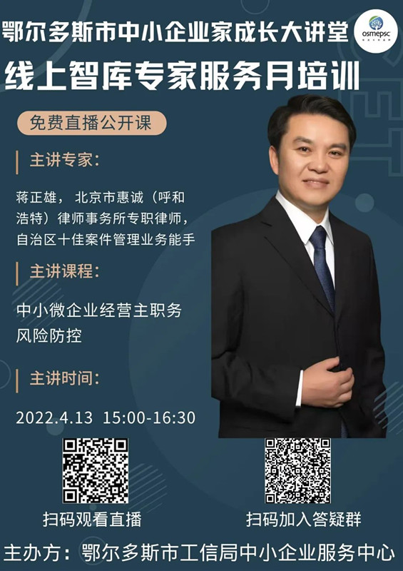 為助力中小微企業(yè)主進(jìn)一步提升對生產(chǎn)經(jīng)營職務(wù)刑事風(fēng)險的防范意識,規(guī)避生產(chǎn)管理中存在的職務(wù)刑事風(fēng)險,2022年4月13日,鄂爾多斯市中小企業(yè)家成長大講堂線上智庫專家服務(wù)月培訓(xùn)將為您帶來精彩直播課程——中小微企業(yè)經(jīng)營主職務(wù)刑事風(fēng)險防控。本次課程我們邀請到鄂爾多斯市中小企業(yè)公共服務(wù)平臺智庫專家,北京市惠誠(呼和浩特)律師事務(wù)所專職律師蔣正雄為大家直播授課。
