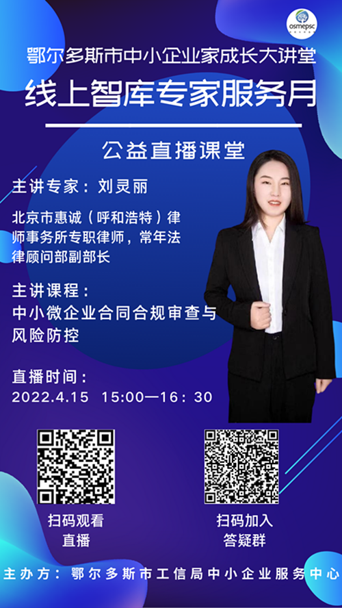 為幫助中小微企業(yè)進一步提高法律風險防范意識,加強風險防控措施,合理規(guī)避法律風險,2022年4月15日,鄂爾多斯市中小企業(yè)家成長大講堂線上智庫專家服務月培訓將為您帶來精彩直播課程——中小微企業(yè)合同合規(guī)審查與風險防控。本次課程我們邀請到鄂爾多斯市中小企業(yè)公共服務平臺智庫專家,北京市惠誠(呼和浩特)律師事務所專職律師——劉靈麗為大家直播授課。
