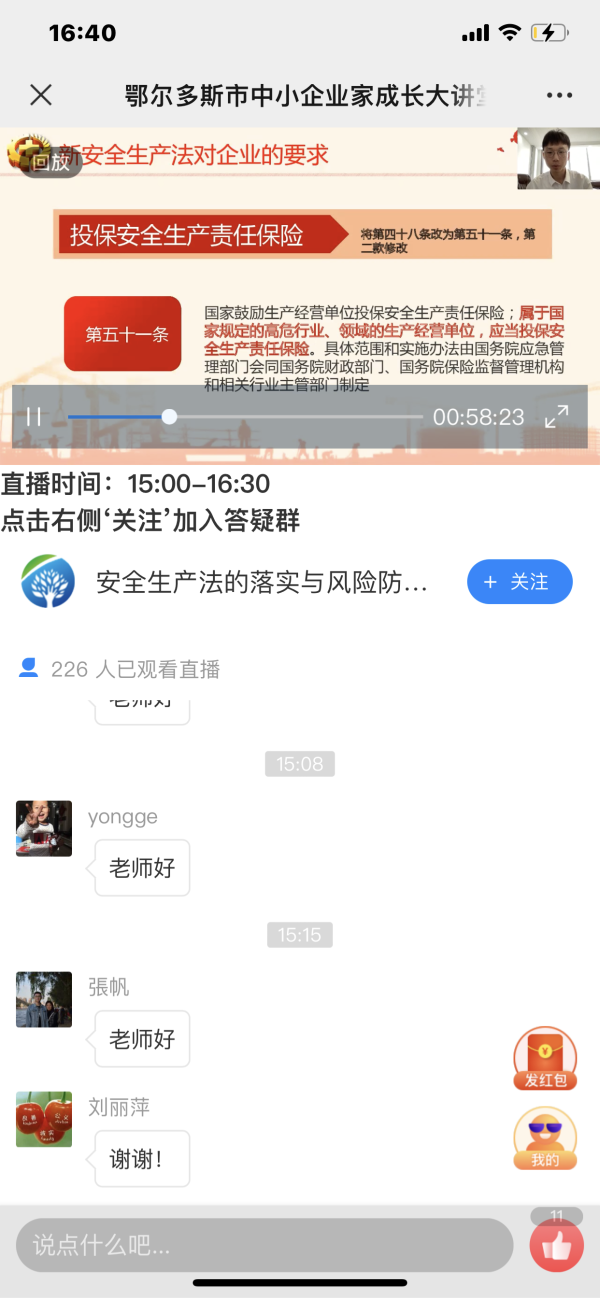 4月11日,舉辦鄂爾多斯市中小企業(yè)家成長大講堂線上智庫專家服務(wù)月培訓(xùn)第十二期““中小微企業(yè)關(guān)于安全生產(chǎn)法的落實與風(fēng)險防控”線上公益專題培訓(xùn)。