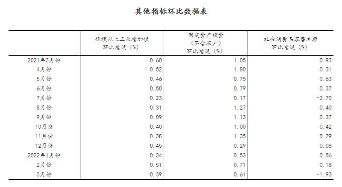(2)根據(jù)季節(jié)調(diào)整模型自動修正結(jié)果,對近一年來各期國內(nèi)生產(chǎn)總值、規(guī)模以上工業(yè)增加值、固定資產(chǎn)投資(不含農(nóng)戶)、社會消費品零售總額環(huán)比增速進行修訂。修訂結(jié)果及2022年一季度GDP環(huán)比數(shù)據(jù)、2022年3月份其他指標(biāo)環(huán)比數(shù)據(jù)如下: