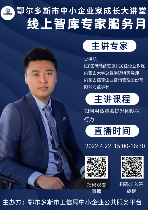 為助力我市中小企業(yè)健康發(fā)展,提升企業(yè)管理的團(tuán)隊(duì)執(zhí)行力,2022年4月22日,鄂爾多斯市中小企業(yè)家成長(zhǎng)大講堂線上智庫(kù)專家服務(wù)月培訓(xùn)將為您帶來(lái)精彩直播課程——如何用私董會(huì)提升團(tuán)隊(duì)執(zhí)行力。本次課程我們邀請(qǐng)到鄂爾多斯市中小企業(yè)公共服務(wù)平臺(tái)智庫(kù)專家,ICF國(guó)際教練聯(lián)盟PCC級(jí)企業(yè)教練、內(nèi)蒙古大學(xué)總裁學(xué)院特聘導(dǎo)師、內(nèi)蒙古蘊(yùn)德企業(yè)咨詢管理股份有限公司董事長(zhǎng)——史洪旭為大家直播授課。
