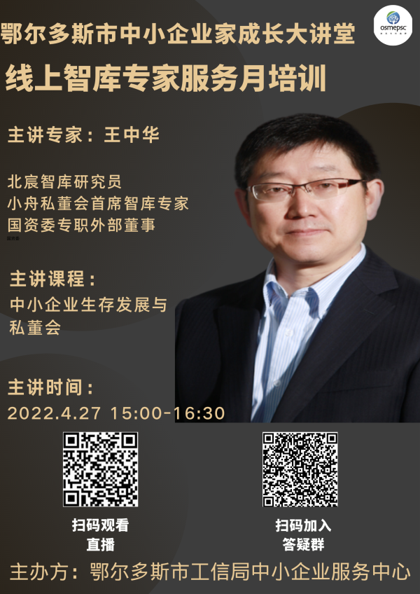 為提高中小企業(yè)管理者的決策能力和工作效率,成長型企業(yè)已廣泛把私董會應(yīng)用到企業(yè)內(nèi)部管理中。為進(jìn)一步提升企業(yè)運(yùn)營能力,2022年4月27日,鄂爾多斯市中小企業(yè)家成長大講堂線上智庫專家服務(wù)月培訓(xùn)將為您帶來精彩直播課程——中小企業(yè)生存發(fā)展與私董會。本次課程我們邀請到鄂爾多斯市中小企業(yè)公共服務(wù)平臺智庫專家,北宸智庫研究員、小舟私董會首席智庫專家、國資委專職外部董事——王中華為大家直播授課。