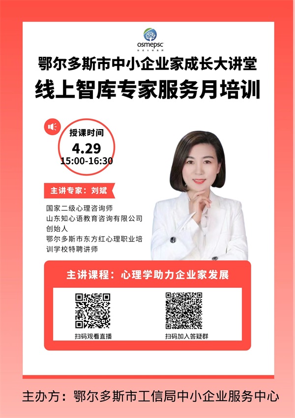心理資本提升是企業(yè)家自身提升和企業(yè)發(fā)展不可或缺的一環(huán)。為進(jìn)一步關(guān)注企業(yè)家心理健康,提升心理素質(zhì),助力企業(yè)健康發(fā)展,2022年4月29日,鄂爾多斯市中小企業(yè)家成長(zhǎng)大講堂線上智庫(kù)專家服務(wù)月將為您帶來精彩直播課程——心理學(xué)助力企業(yè)家發(fā)展。本次課程我們邀請(qǐng)到鄂爾多斯市中小企業(yè)公共服務(wù)平臺(tái)智庫(kù)專家,國(guó)家二級(jí)心理咨詢師、山東知心語(yǔ)教育咨詢有限公司創(chuàng)始人、鄂爾多斯市東方紅心理職業(yè)培訓(xùn)學(xué)校特聘講師——劉斌為大家直播授課。