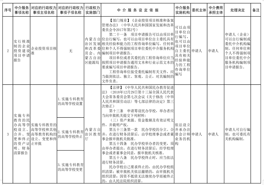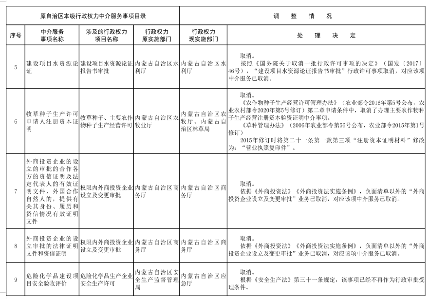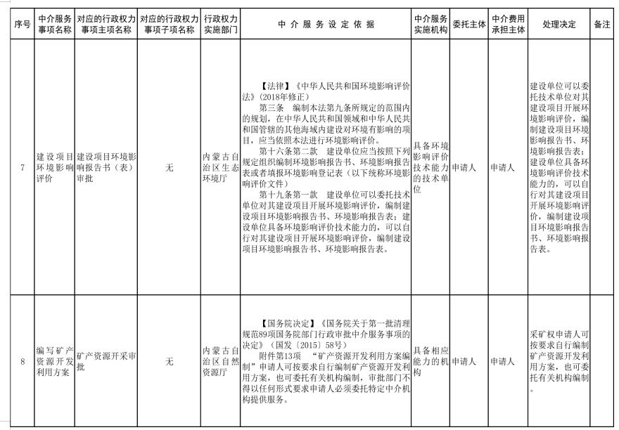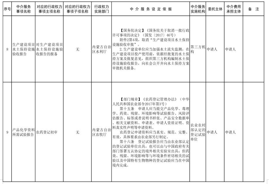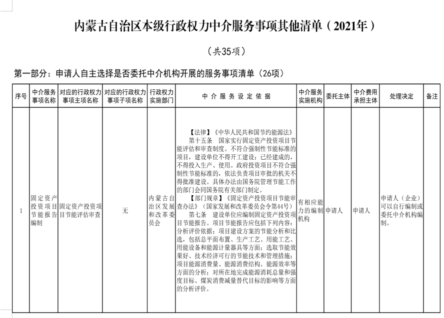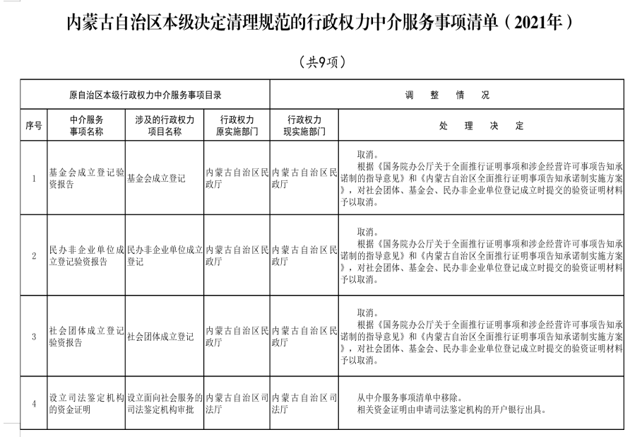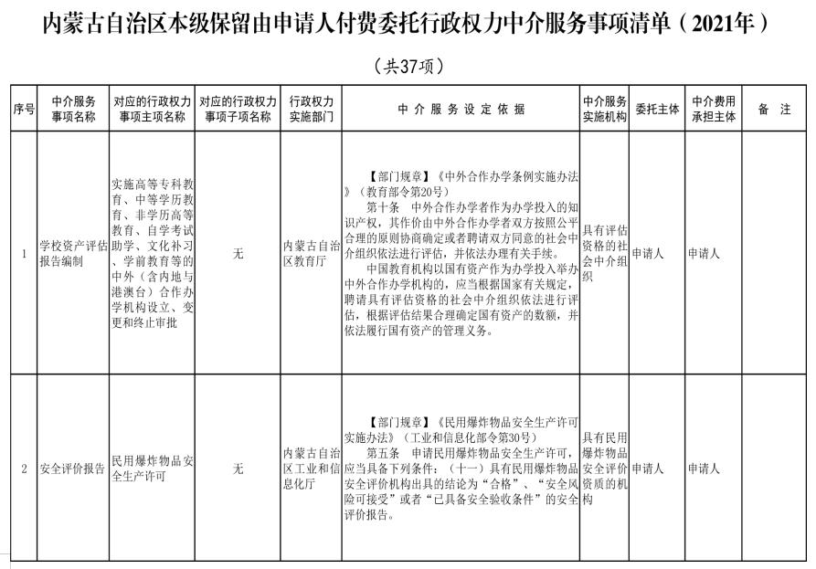 為規(guī)范行政權(quán)力中介服務(wù)行為,促進中介服務(wù)市場健康發(fā)展,按照《優(yōu)化營商環(huán)境條例》(國務(wù)院令第722號)、《國務(wù)院辦公廳關(guān)于清理規(guī)范國務(wù)院部門行政審批中介服務(wù)的通知》(國辦發(fā)〔2015〕31號)、《國務(wù)院關(guān)于第三批清理規(guī)范國務(wù)院部門行政審批中介服務(wù)事項的決定》(國發(fā)〔2017〕8號)等法規(guī)文件精神及自治區(qū)黨委和政府相關(guān)工作要求,經(jīng)對自治區(qū)本級各部門開展行政審批、備案等工作中涉及的中介服務(wù)事項進行清理和規(guī)范,現(xiàn)將《內(nèi)蒙古自治區(qū)本級保留由申請人付費委托行政權(quán)力中介服務(wù)事項清單(2021年)》《內(nèi)蒙古自治區(qū)本級行政權(quán)力中介服務(wù)事項其他清單(2021年)》(第一部分申請人自主選擇是否委托中介機構(gòu)開展的服務(wù)事項清單和第二部分審批部門付費委托中介機構(gòu)開展的服務(wù)事項清單)、《內(nèi)蒙古自治區(qū)本級決定清理規(guī)范的行政權(quán)力中介服務(wù)事項清單(2021年)》印發(fā)給你們,并提出以下意見,請一并貫徹落實。