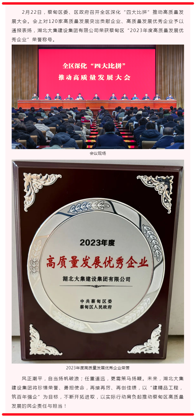 開(kāi)門紅|湖北大集建設(shè)集團(tuán)榮獲蔡甸區(qū)“2023年度高質(zhì)量發(fā)展優(yōu)秀企業(yè)”榮譽(yù)
