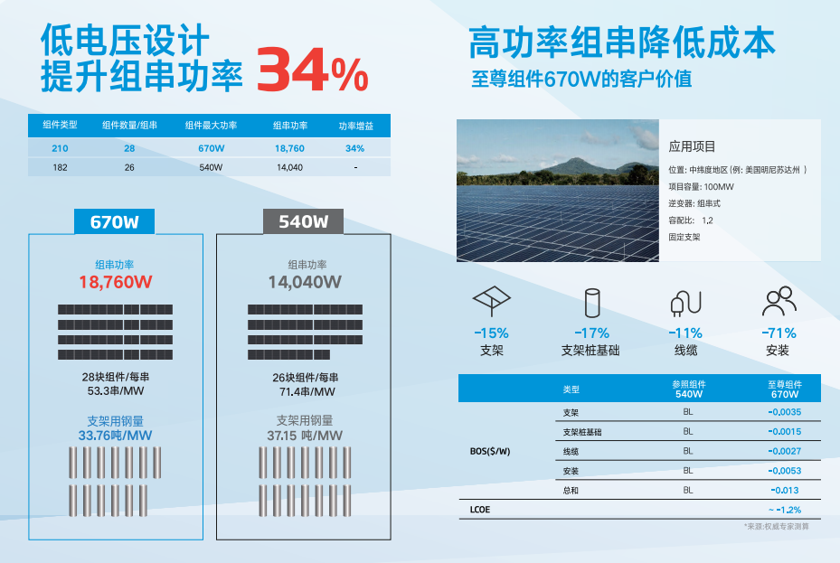 尺寸為2384mm*1303mm。210組件獨有的低電壓設計,在大功率組串逆變器1500V系統(tǒng)下,使組串再次提升,在一定容量下組件塊數變少,相應的支架、樁基礎、直流線纜、橋架及人工等成本下降,從而降低系統(tǒng)成本。結合雙面雙玻技術,( 首年衰減2%,逐年衰減0.45%以及70%±5的背面率)適用于大型地面電站、漁光互補、農光互補等項目。