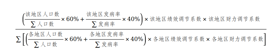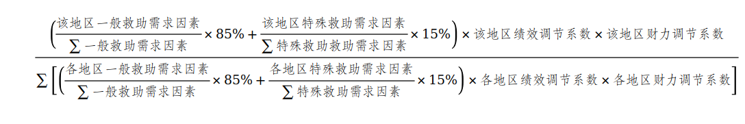 其中,城鄉(xiāng)醫(yī)療救助補(bǔ)助資金主要考慮一般救助需求因素和特殊救助需求因素,并使用績(jī)效調(diào)節(jié)系數(shù)、財(cái)力調(diào)節(jié)系數(shù)進(jìn)行適當(dāng)調(diào)節(jié)。特殊救助需求因素主要是對(duì)國(guó)家鄉(xiāng)村振興重點(diǎn)幫扶縣和地方病防治工作任務(wù)較重的地區(qū)給予傾斜支持。測(cè)算公式為: