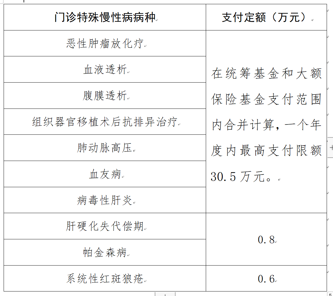 (二)門診特殊慢性病在統(tǒng)籌基金和大額保險(xiǎn)基金支付范圍內(nèi)合并計(jì)算,一個(gè)年度內(nèi)最高支付限額30.5萬元。