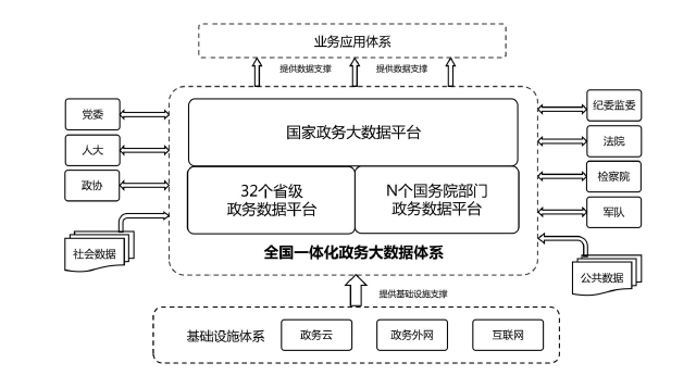 圖3國(guó)家平臺(tái)與地方和部門平臺(tái)有關(guān)系統(tǒng)關(guān)系圖 (三)與相關(guān)系統(tǒng)的關(guān)系。 1.整合全國(guó)一體化政務(wù)服務(wù)平臺(tái)和國(guó)家數(shù)據(jù)共享交換平臺(tái)等現(xiàn)有數(shù)據(jù)共享渠道,充分利用全國(guó)一體化政務(wù)服務(wù)平臺(tái)和國(guó)家“互聯(lián)網(wǎng)+監(jiān)管”系統(tǒng)現(xiàn)有資源和能力,優(yōu)化政務(wù)數(shù)據(jù)服務(wù)總門戶,構(gòu)建形成統(tǒng)一政務(wù)數(shù)據(jù)目錄、統(tǒng)一政務(wù)數(shù)據(jù)需求申請(qǐng)標(biāo)準(zhǔn)和統(tǒng)一數(shù)據(jù)共享交換規(guī)則,為各地區(qū)各部門提供協(xié)同高效的政務(wù)數(shù)據(jù)服務(wù)。 2.涉密數(shù)據(jù)依托國(guó)家電子政務(wù)內(nèi)網(wǎng)開展共享,推進(jìn)政務(wù)內(nèi)網(wǎng)與政務(wù)外網(wǎng)數(shù)據(jù)共享交換,建設(shè)政務(wù)外網(wǎng)數(shù)據(jù)向政務(wù)內(nèi)網(wǎng)安全導(dǎo)入通道,以及政務(wù)內(nèi)網(wǎng)非涉密數(shù)據(jù)向政務(wù)外網(wǎng)安全導(dǎo)出通道,實(shí)現(xiàn)非涉密數(shù)據(jù)與政務(wù)內(nèi)網(wǎng)共享有效交互、涉密數(shù)據(jù)脫密后依托國(guó)家政務(wù)大數(shù)據(jù)平臺(tái)安全共享、有序開放利用。 3.全國(guó)一體化政務(wù)大數(shù)據(jù)體系具備對(duì)接黨委、人大、政協(xié)、紀(jì)委監(jiān)委、法院、檢察院和軍隊(duì)等機(jī)構(gòu)數(shù)據(jù)的能力,應(yīng)遵循互聯(lián)互通、資源共享的原則,結(jié)合實(shí)際情況采用總對(duì)總系統(tǒng)聯(lián)通或分級(jí)對(duì)接。 4.全國(guó)一體化政務(wù)大數(shù)據(jù)體系按需接入供水、供電、供氣、公共交通等公共服務(wù)運(yùn)營(yíng)單位在依法履職或者提供公共服務(wù)過程中收集、產(chǎn)生的公共數(shù)據(jù),以及第三方互聯(lián)網(wǎng)信息平臺(tái)和其他領(lǐng)域的社會(huì)數(shù)據(jù),結(jié)合實(shí)際研究確定對(duì)接方式等,依法依規(guī)推進(jìn)公共數(shù)據(jù)和社會(huì)數(shù)據(jù)有序共享、合理利用,促進(jìn)公共數(shù)據(jù)與社會(huì)數(shù)據(jù)融合應(yīng)用。 5.推進(jìn)全國(guó)一體化政務(wù)大數(shù)據(jù)體系與全國(guó)一體化大數(shù)據(jù)中心協(xié)同創(chuàng)新體系融合對(duì)接,充分利用云、網(wǎng)等基礎(chǔ)資源,發(fā)揮云資源集約調(diào)度優(yōu)勢(shì),提升資源調(diào)度能力,更好滿足各地區(qū)各部門業(yè)務(wù)應(yīng)用系統(tǒng)的數(shù)據(jù)共享需求,為企業(yè)和群眾提供政務(wù)數(shù)據(jù)開放服務(wù)。