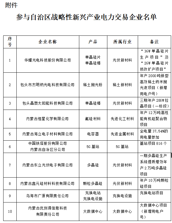 附件: 參與自治區(qū)戰(zhàn)略性新興產(chǎn)業(yè)電力交易企業(yè)名單