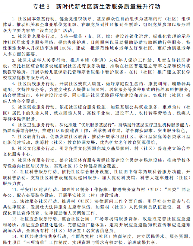 全面推進(jìn)城市一刻鐘便民生活圈建設(shè),加快推進(jìn)農(nóng)村生活服務(wù)便利化。引導(dǎo)市場(chǎng)、社會(huì)力量發(fā)展社區(qū)托育、養(yǎng)老等服務(wù)業(yè)態(tài)。推動(dòng)物流配送、快遞、再生資源回收網(wǎng)點(diǎn)設(shè)施輻射符合條件的村(社區(qū)),鼓勵(lì)發(fā)展社區(qū)物業(yè)、維修、家政、餐飲、零售、美容美發(fā)等生活性服務(wù)業(yè),支持相關(guān)企業(yè)在村(社區(qū))設(shè)置服務(wù)網(wǎng)點(diǎn),滿足居民多樣化需求。鼓勵(lì)有條件的地方引進(jìn)專業(yè)化物業(yè)服務(wù),建立健全業(yè)主和物業(yè)服務(wù)企業(yè)雙向選擇機(jī)制。完善城市居民委員會(huì)組織體系,指導(dǎo)和監(jiān)督業(yè)主委員會(huì)、物業(yè)服務(wù)企業(yè)依法履行職責(zé)。依托村級(jí)綜合服務(wù)設(shè)施、供銷合作社等強(qiáng)化農(nóng)村地區(qū)農(nóng)產(chǎn)品收購、農(nóng)資供應(yīng)等服務(wù)供給。