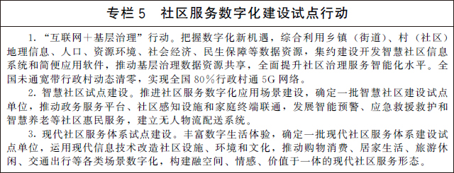 開發(fā)社區(qū)協(xié)商議事、政務(wù)服務(wù)辦理、養(yǎng)老、家政、衛(wèi)生、托育等網(wǎng)上服務(wù)項(xiàng)目應(yīng)用,推動(dòng)社區(qū)物業(yè)設(shè)備設(shè)施、安防等智能化改造升級(jí)。集約建設(shè)智慧社區(qū)信息系統(tǒng),開發(fā)智慧社區(qū)移動(dòng)應(yīng)用服務(wù),加速線上線下融合。推進(jìn)數(shù)字社區(qū)服務(wù)圈、智慧家庭建設(shè),促進(jìn)社區(qū)家庭聯(lián)動(dòng)智慧服務(wù)生活圈發(fā)展。大力發(fā)展社區(qū)電子商務(wù),探索推動(dòng)無人物流配送進(jìn)社區(qū)。推動(dòng)“互聯(lián)網(wǎng)+”與社區(qū)服務(wù)的深度融合,逐步構(gòu)建服務(wù)便捷、管理精細(xì)、設(shè)施智能、環(huán)境宜居、私密安全的智慧社區(qū)。以縣(市、區(qū)、旗)為單位,支持利用互聯(lián)網(wǎng)、物聯(lián)網(wǎng)、區(qū)塊鏈等現(xiàn)代信息技術(shù),深入組織開展智慧社區(qū)、現(xiàn)代社區(qū)服務(wù)體系試點(diǎn)建設(shè),高效匹配社區(qū)全生活鏈供需,擴(kuò)大多層次便利化社會(huì)服務(wù)供給。鼓勵(lì)社會(huì)資本投資建設(shè)智慧社區(qū),運(yùn)用第五代移動(dòng)通信(5G)、物聯(lián)網(wǎng)等現(xiàn)代信息技術(shù)推進(jìn)智慧社區(qū)信息基礎(chǔ)設(shè)施建設(shè)。