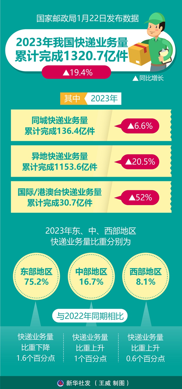 圖表:2023年我國快遞業(yè)務(wù)量累計(jì)完成1320.7億件