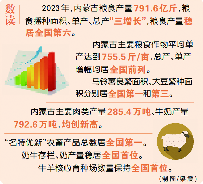 數(shù)字是發(fā)展最好的注腳。過去一年,內(nèi)蒙古緊扣“地、水、種”和“糧、肉、奶”6個重點,全力推動糧食單產(chǎn)再提高、牲畜養(yǎng)殖再增效,不斷擴大數(shù)量、提高質(zhì)量、增加產(chǎn)量,努力把國家重要農(nóng)畜產(chǎn)品生產(chǎn)基地建設(shè)得量大質(zhì)優(yōu),切實當(dāng)好國家糧食安全“壓艙石”。