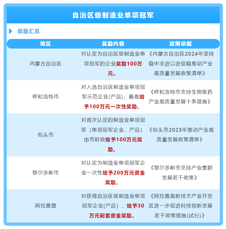 自治區(qū)級制造業(yè)單項冠軍獎勵匯總