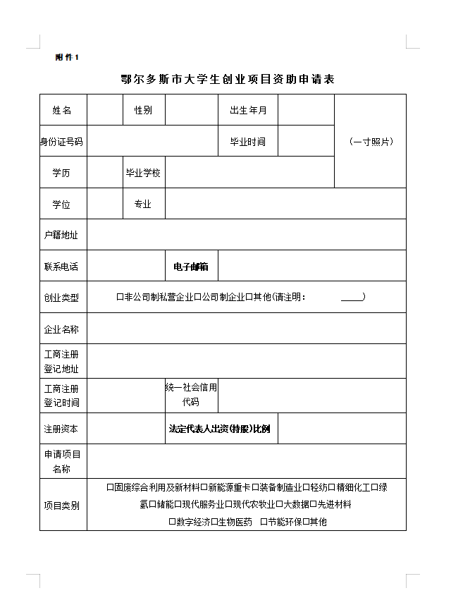 1)《鄂爾多斯市大學(xué)生創(chuàng)業(yè)項(xiàng)目資助資金申請(qǐng)表》;