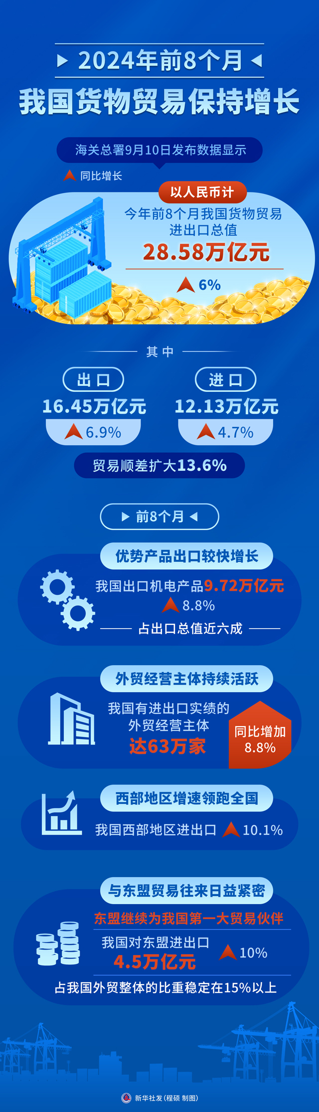 面對(duì)復(fù)雜嚴(yán)峻的外部形勢(shì),我國(guó)外貿(mào)持續(xù)展現(xiàn)較強(qiáng)韌性。海關(guān)總署9月10日發(fā)布數(shù)據(jù)顯示,以人民幣計(jì),今年前8個(gè)月我國(guó)貨物貿(mào)易進(jìn)出口總值28.58萬(wàn)億元,同比增長(zhǎng)6%。其中,出口16.45萬(wàn)億元,進(jìn)口12.13萬(wàn)億元,同比分別增長(zhǎng)6.9%和4.7%,貿(mào)易順差擴(kuò)大13.6%