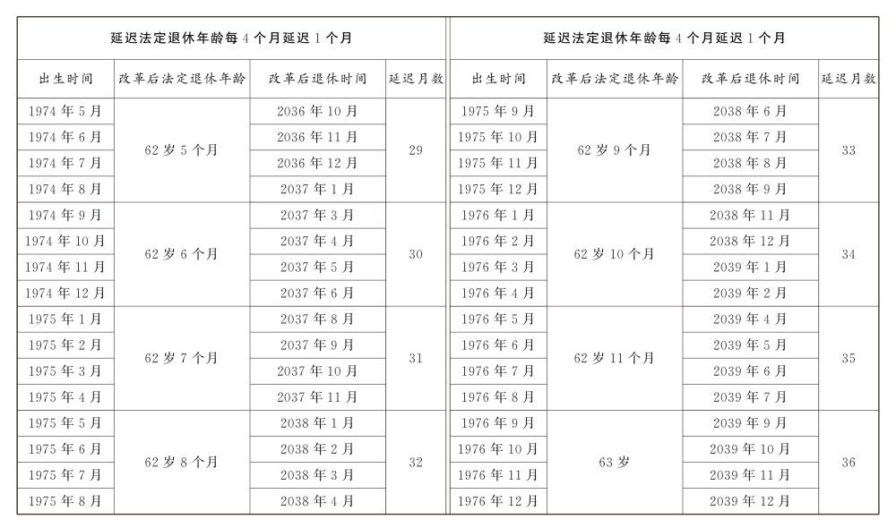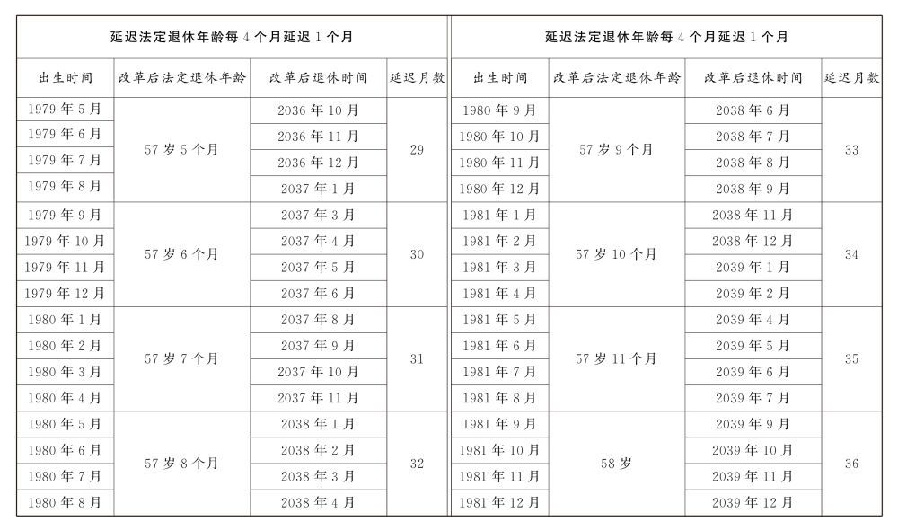 第一條 從2025年1月1日起,男職工和原法定退休年齡為五十五周歲的女職工,法定退休年齡每四個(gè)月延遲一個(gè)月,分別逐步延遲至六十三周歲和五十八周歲;原法定退休年齡為五十周歲的女職工,法定退休年齡每二個(gè)月延遲一個(gè)月,逐步延遲至五十五周歲。國家另有規(guī)定的,從其規(guī)定。