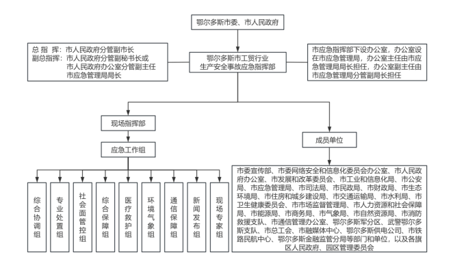 (4)綜合保障組:由事發(fā)地旗區(qū)人民政府、園區(qū)管理委員會(huì)牽頭,市發(fā)展和改革委員會(huì)、市工業(yè)和信息化局、市民政局、市交通運(yùn)輸局、市水利局、市商務(wù)局、市應(yīng)急管理局、市能源局、鄂爾多斯供電公司等相關(guān)部門配合。