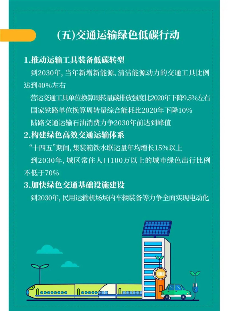 2.構(gòu)建綠色高效交通運(yùn)輸體系。發(fā)展智能交通,推動不同運(yùn)輸方式合理分工、有效銜接,降低空載率和不合理客貨運(yùn)周轉(zhuǎn)量。大力發(fā)展以鐵路、水路為骨干的多式聯(lián)運(yùn),推進(jìn)工礦企業(yè)、港口、物流園區(qū)等鐵路專用線建設(shè),加快內(nèi)河高等級航道網(wǎng)建設(shè),加快大宗貨物和中長距離貨物運(yùn)輸“公轉(zhuǎn)鐵”、“公轉(zhuǎn)水”。加快先進(jìn)適用技術(shù)應(yīng)用,提升民航運(yùn)行管理效率,引導(dǎo)航空企業(yè)加強(qiáng)智慧運(yùn)行,實(shí)現(xiàn)系統(tǒng)化節(jié)能降碳。加快城鄉(xiāng)物流配送體系建設(shè),創(chuàng)新綠色低碳、集約高效的配送模式。打造高效銜接、快捷舒適的公共交通服務(wù)體系,積極引導(dǎo)公眾選擇綠色低碳交通方式。“十四五”期間,集裝箱鐵水聯(lián)運(yùn)量年均增長15%以上。到2030年,城區(qū)常住人口100萬以上的城市綠色出行比例不低于70%。