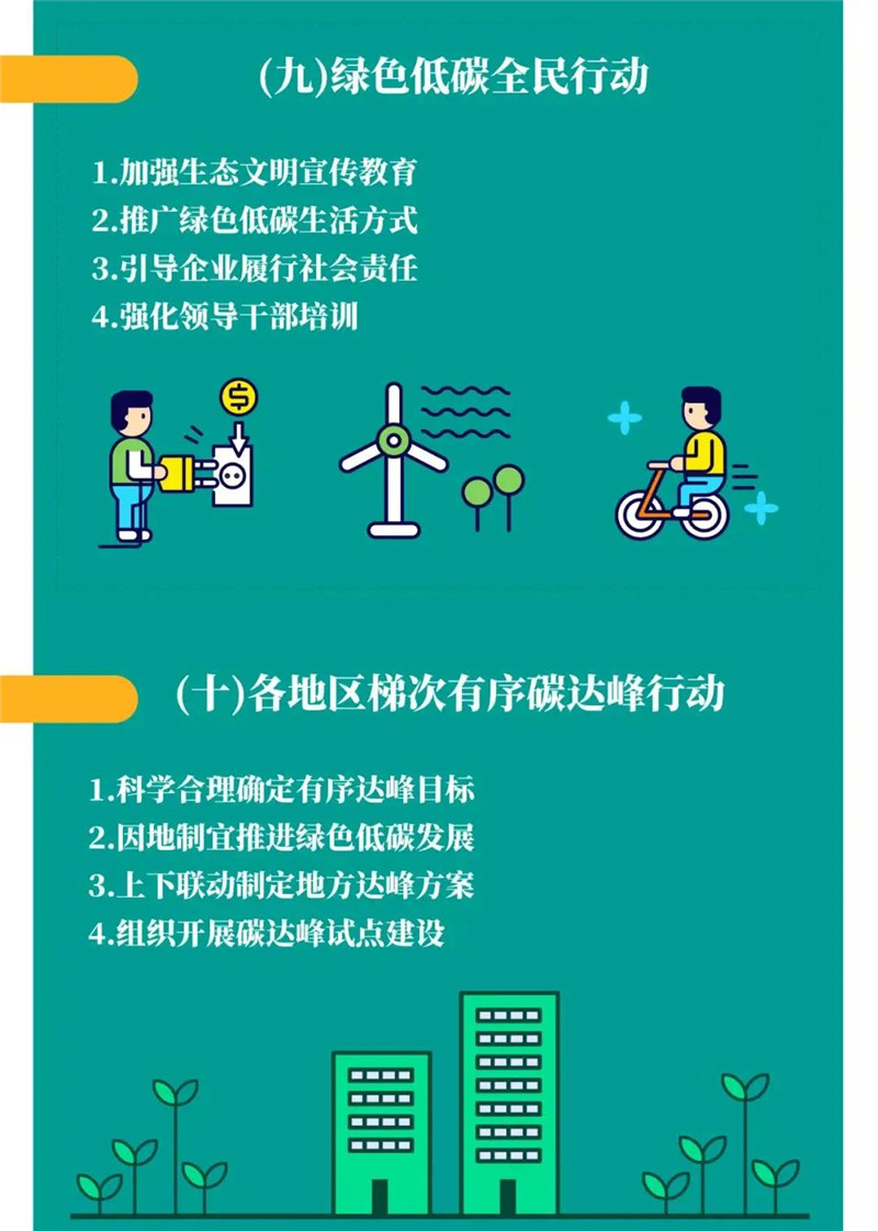 將碳達(dá)峰貫穿于經(jīng)濟(jì)社會發(fā)展全過程和各方面,重點(diǎn)實(shí)施能源綠色低碳轉(zhuǎn)型行動、節(jié)能降碳增效行動、工業(yè)領(lǐng)域碳達(dá)峰行動、城鄉(xiāng)建設(shè)碳達(dá)峰行動、交通運(yùn)輸綠色低碳行動、循環(huán)經(jīng)濟(jì)助力降碳行動、綠色低碳科技創(chuàng)新行動、碳匯能力鞏固提升行動、綠色低碳全民行動、各地區(qū)梯次有序碳達(dá)峰行動等“碳達(dá)峰十大行動”。