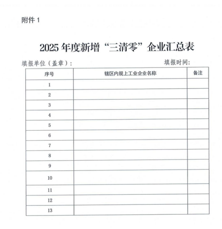 1.建立工作臺賬,填寫上報2025年度新增“三清零”企業(yè)匯總表(見附件1)。