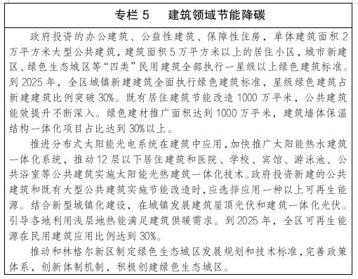 加快發(fā)展綠色建筑。嚴(yán)格執(zhí)行建筑節(jié)能強(qiáng)制性標(biāo)準(zhǔn),擴(kuò)大綠色建筑標(biāo)準(zhǔn)執(zhí)行范圍,加快綠色建筑由單體、組團(tuán)向小區(qū)化、區(qū)域化發(fā)展,加強(qiáng)綠色生態(tài)小區(qū)建設(shè)。穩(wěn)步推進(jìn)被動(dòng)式超低能耗建筑發(fā)展,建設(shè)一批超低能耗建筑、近零能耗建筑。因地制宜推進(jìn)太陽能、地?zé)崮?、空氣能等能源在建筑中的?yīng)用,減少民用建筑常規(guī)能源使用。繼續(xù)推進(jìn)城鎮(zhèn)老舊小區(qū)既有居住建筑節(jié)能改造,鼓勵(lì)農(nóng)村牧區(qū)房屋建設(shè)項(xiàng)目執(zhí)行節(jié)能及綠色建設(shè)標(biāo)準(zhǔn)。到2025年,全區(qū)城鎮(zhèn)新建建筑全面執(zhí)行綠色建筑標(biāo)準(zhǔn),基本完成全區(qū)2005年前建成的城鎮(zhèn)老舊小區(qū)改造,既有居住建筑節(jié)能改造完成1000萬平方米。
