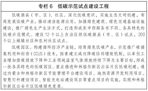 低碳旗縣(市、區(qū))試點(diǎn)。明確自治區(qū)低碳旗縣(市、區(qū))建設(shè)內(nèi)容和建設(shè)標(biāo)準(zhǔn),完善激勵(lì)政策和投融資渠道,開展試點(diǎn)旗縣(市、區(qū))低碳發(fā)展建設(shè)工作,鼓勵(lì)開展碳排放達(dá)峰行動(dòng),支持試點(diǎn)率先達(dá)峰。“十四五”末,力爭創(chuàng)建12個(gè)自治區(qū)級(jí)低碳旗縣(市、區(qū))試點(diǎn),其中一半以上建設(shè)成為環(huán)境質(zhì)量達(dá)標(biāo)和二氧化碳排放達(dá)峰“雙達(dá)”試點(diǎn)示范。