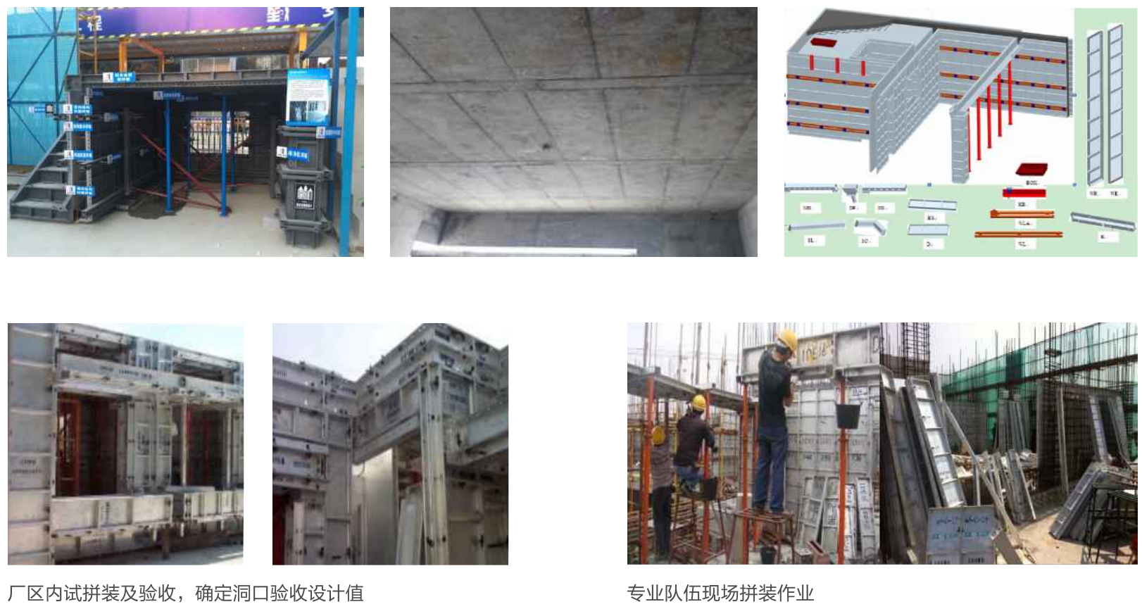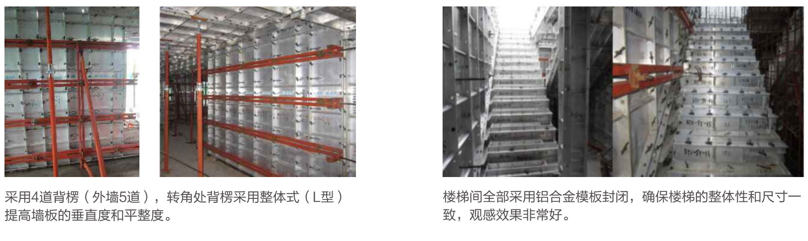 模板系統(tǒng)構(gòu)成混凝土結(jié)構(gòu)施工所需的封閉面,保證混凝土澆灌時建筑結(jié)構(gòu)成型;支撐系統(tǒng)在混凝土結(jié)構(gòu)施工過程中起支撐作用,保證樓面、梁底及懸挑結(jié)構(gòu)的支撐穩(wěn)固;緊固系統(tǒng)是保證模板成型的結(jié)構(gòu)寬度尺寸,在澆注混凝土過程中不產(chǎn)生變形,模板不出現(xiàn)漲模、爆?,F(xiàn)象;附件系統(tǒng)為模板的連接構(gòu)件,使單件模板連接成系統(tǒng),組成整體。該技術(shù)增加了混凝土的成型質(zhì)量和感觀質(zhì)量。