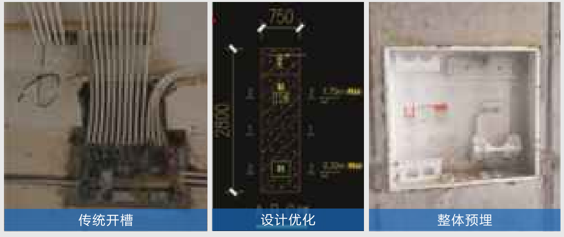 強(qiáng)弱電箱原圖紙?jiān)谄鲶w上開(kāi)槽后埋線盒子,再進(jìn)行用砂漿修補(bǔ),這樣在工人施工過(guò)程中容易鑿斷或者震裂砌墻,后期修補(bǔ)因砂漿過(guò)厚也會(huì)引起面層開(kāi)裂。為確保質(zhì)量,經(jīng)過(guò)設(shè)計(jì)優(yōu)化,增加構(gòu)造柱預(yù)埋線管及電箱,這樣不但解決開(kāi)裂問(wèn)題,加快了施工進(jìn)度,大大消除了質(zhì)量風(fēng)險(xiǎn)。